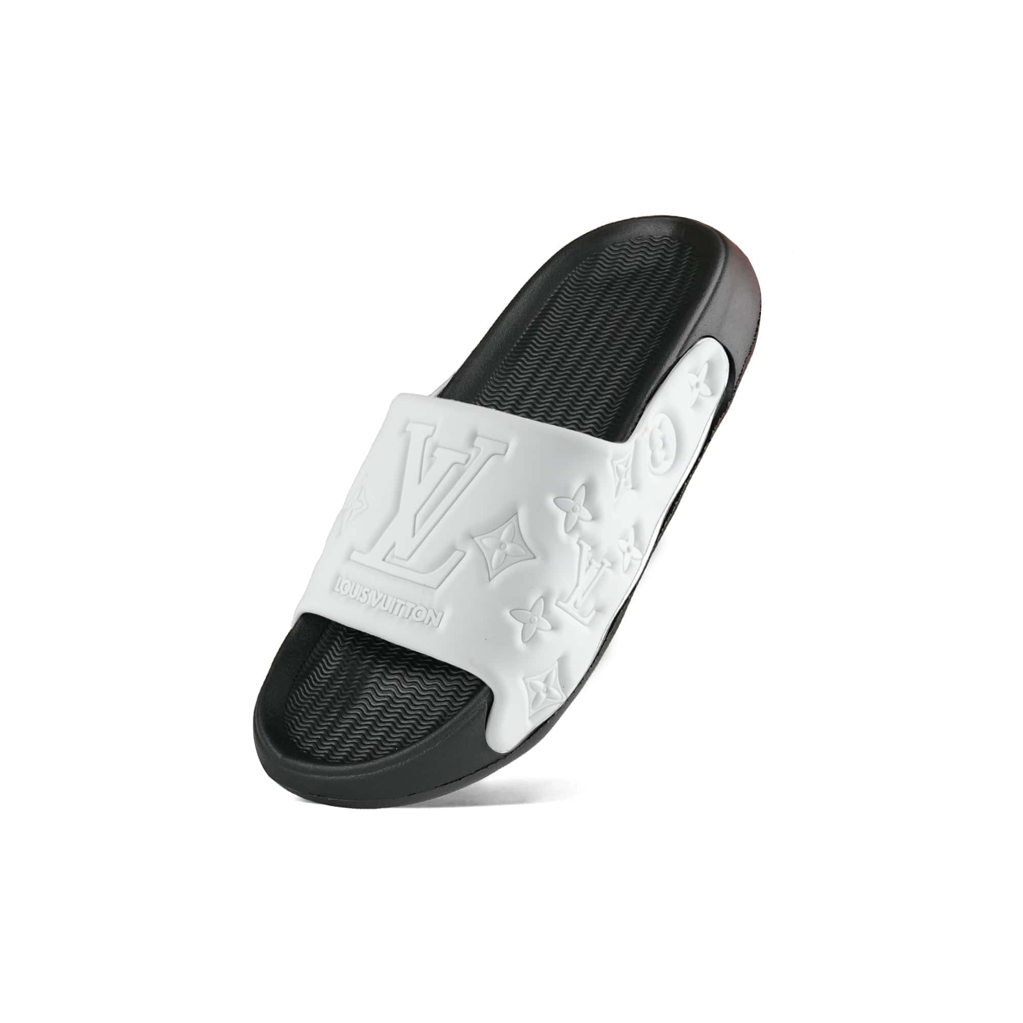 Brand Louis VuittonColor Black sole white strapDesign Embossed monogram and LV logoMaterial Durable and comfortable syntheticUsage Ideal for casual and everyday wear